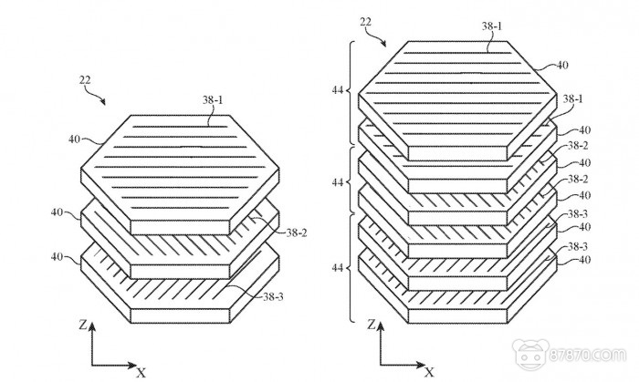 苹果公司的建议是为每只眼睛使用一叠镜片,这可以是一个液晶可调镜片,同时还有一个非液晶可调镜片,如充液镜片或阿尔瓦雷斯镜片。液晶透镜可以包括多个填充有电压调制光学材料的单元,夹在透明基片之间,周围有电极。叠加的透镜和电极可以对用户的视觉调整进行精细控制。电极用于向光学材料施加功率,调整其相位曲线,从而调整其允许光线通过的方式。可以使用多层电极,有三个或更多的方向,允许非常精确地调整该层,这取决于需要对视力进行何种修正。