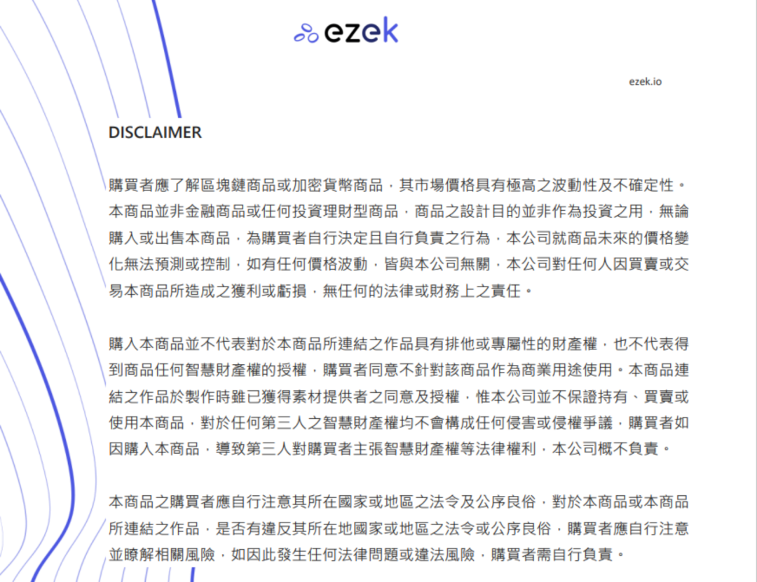 在周杰伦加持NFT项目的官网免责声明里,Ezek也表示,“本商品并非金融商品或任何投资理财型商品,商品之设计目的并非作为投资之用,无论购入或出售本商品,为购买者自行决定且自行负责之行为,本公司就商品未来的价格变化无法预测或控制,如有任何价格波动,皆与本公司无关。”